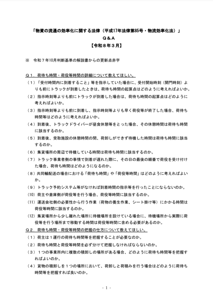 ·トラック側の都合で遅れた場合:到着の遅れによって荷役の順番が後ろ倒しになり、それによって生じた追加的な待機時間は、荷待ち時間には含まれません 。ただし、意図的に過度な長時間待機を強要された場合は、荷待ち時間に含まれる可能性があります。