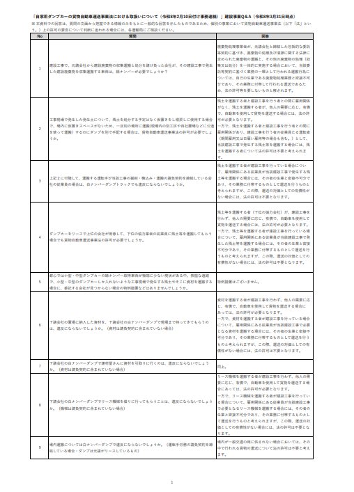 「自家用ダンプカーの貨物自動車運送事業法における取扱いについて」建設事業Q&A(令和8年3月31日時点)